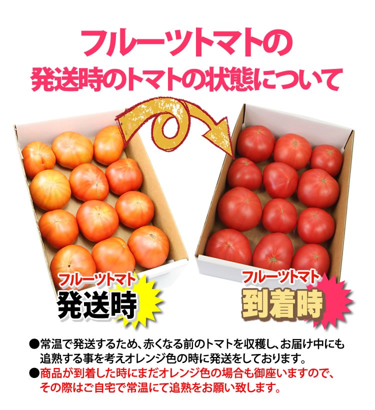 商品は通常便でのお届けとなります。トマトを収穫してから追熟が必要です。お届け時に食べ頃になるよう発送いたしますが、お届け条件によって変化するため、到着後すぐに箱の中をご確認頂き、真っ赤な状態であれば食べ頃となります。追熟が必要な場合は冷蔵庫以外の涼しい場所でトマトが真っ赤になるまでお待ち頂き、お召し上がりください。