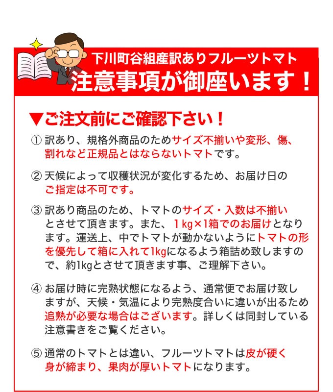 ■運送中にトマトが箱の中で動かないよう、トマトをきっちり箱に入れるため、約1kgにて発送したしますので、ご了承ください。