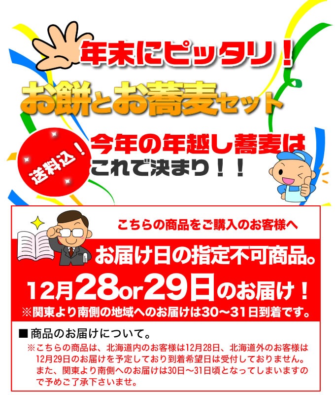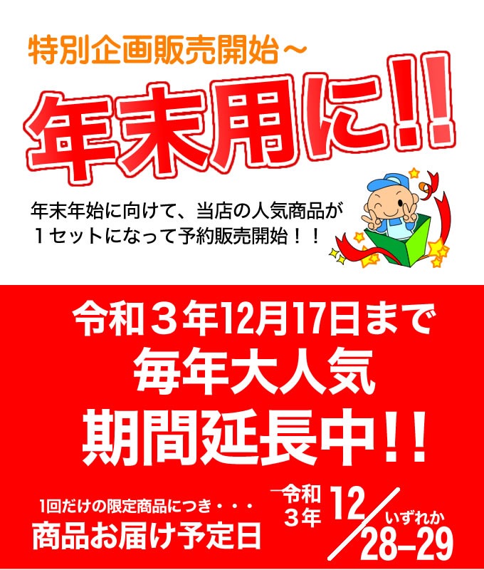 ■お届けについて、北海道内は12月28日頃、その他地域は12月29日頃のお届け限定となります。関東エリアより南地域へのお届けには、気象条件等により更に日数が発生してしまいますので予めご了承下さいませ。